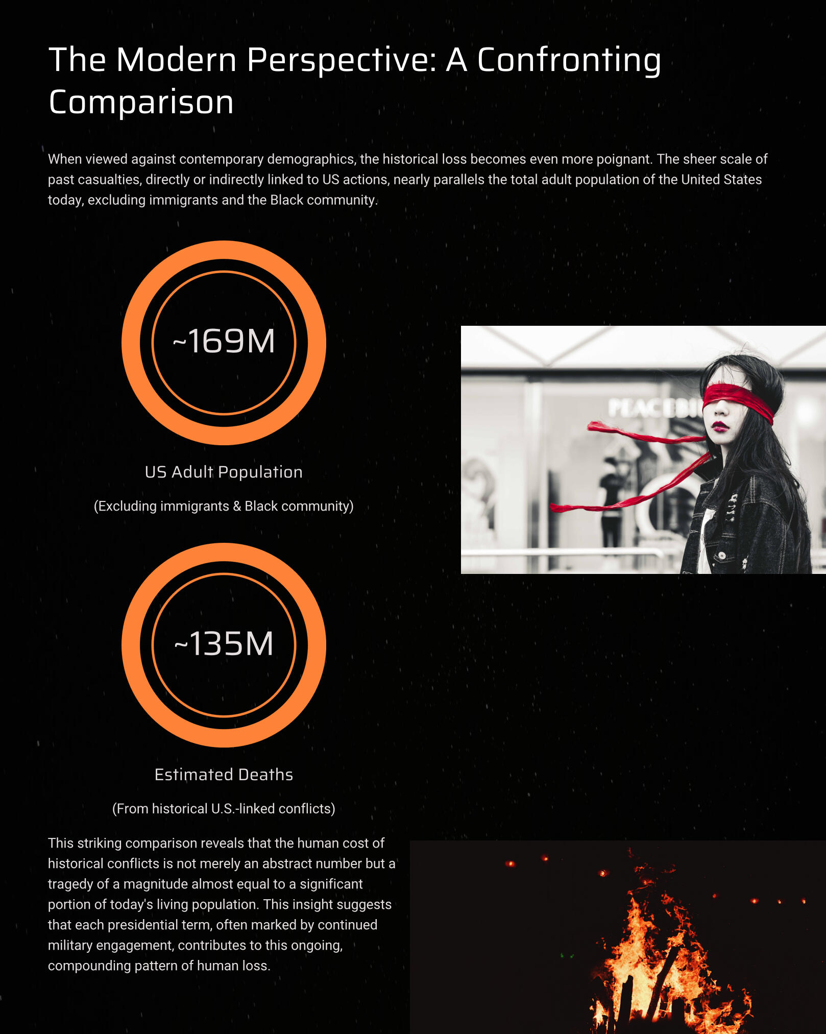 • Estimated deaths from historical U.S.-linked global conflicts: ~135 million