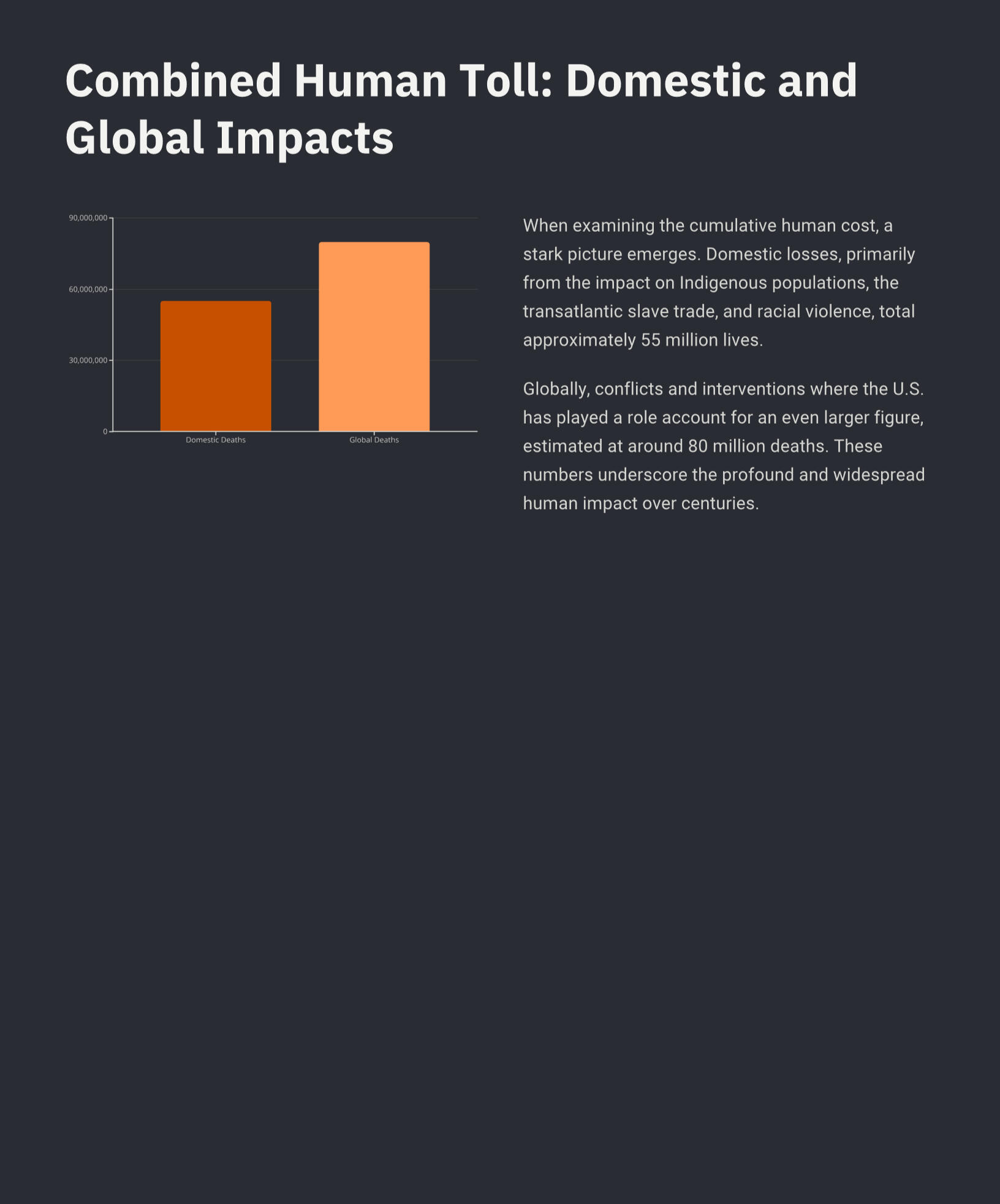 The Holocaust was a concentrated, state-driven campaign of industrialized extermination over a very short period. Its horror is in its systematic efficiency and intent.America represents a cumulative, civilizational toll over four centuries. It is not one event, but the sum of multiple systems—colonial displacement, the slave trade, frontier wars, and international conflicts—operating across continents. The death toll is catastrophic not because of the speed of killing, but because of its relentless duration and embeddedness in the process of expansion and global engagement.