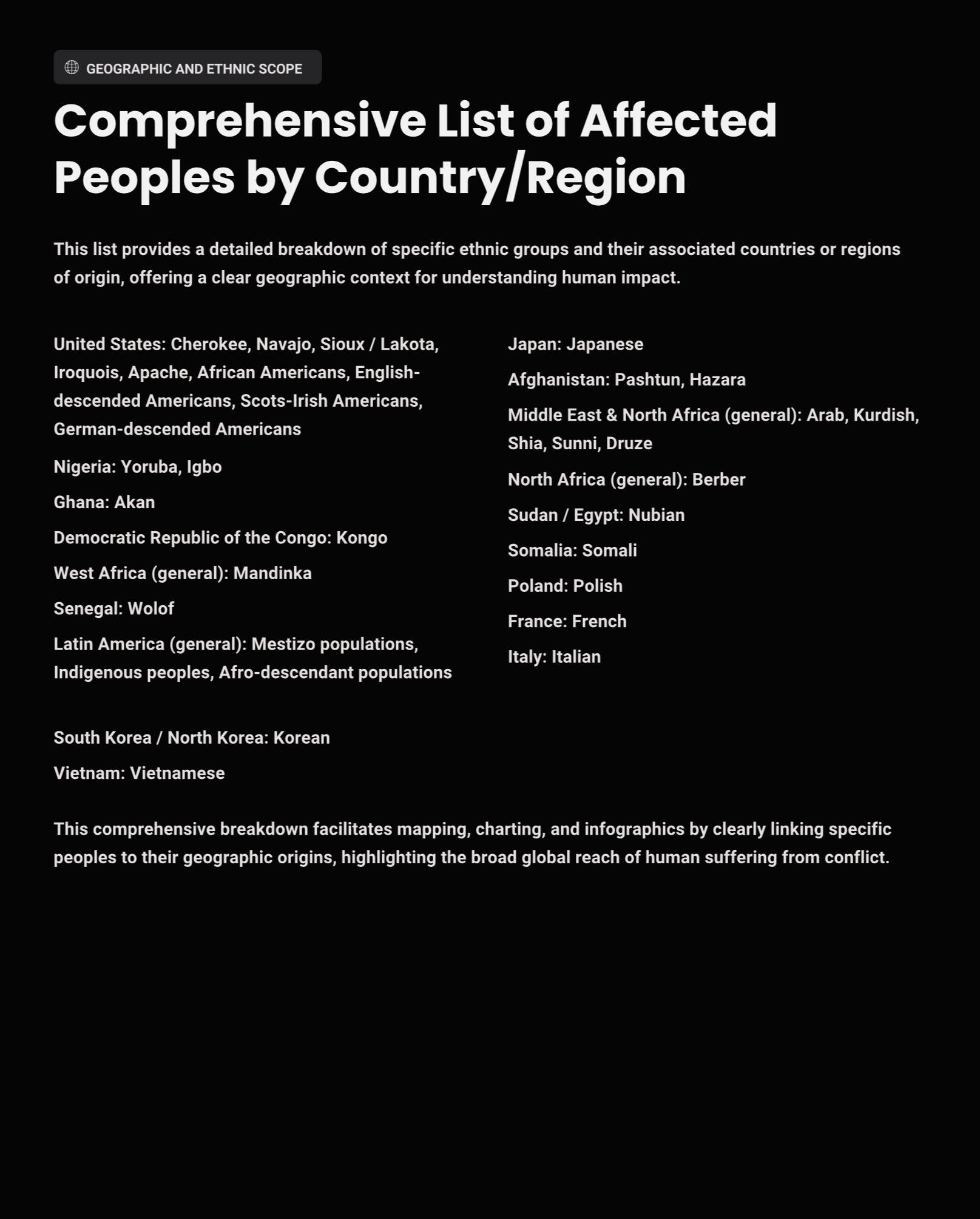 Conflict/ Period Timeframe Estimated DeathsBlack American ExperienceTransatlantic Slave Trade: ~10 million lives lostAmerican Racial Violence (1619–2026): ~5 million lives lostTotal: ~15 million livesIndigenous ExperienceColonization & Indian Wars (1600–1890): 1–50 million lives lostFrontier Conflicts (1780–1890): 500,000–1,000,000 lives lostLow estimated total: ~2.1 million | High estimated total: ~52 million